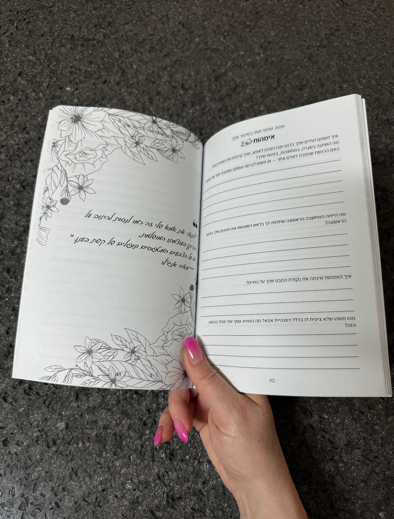 היומן בנוי בצורה מודרכת ועדינה, עם שאלות פתוחות, מרחב לכתיבה אישית וטון שלא שופט.